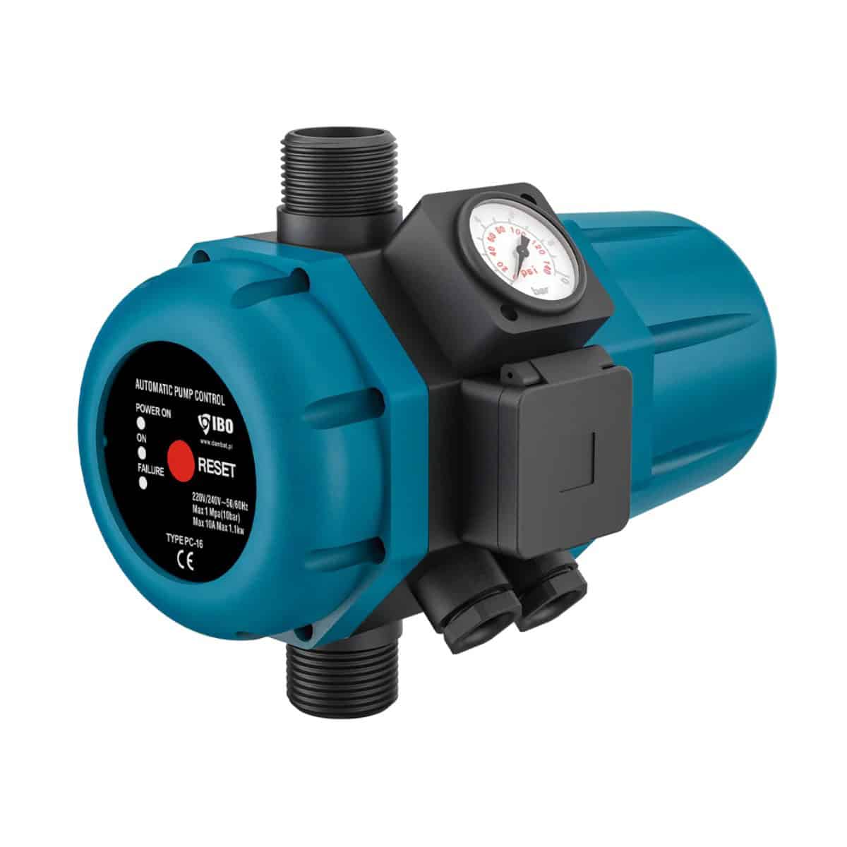 Prescontrol electronic PC-16, echipat cu manometru integrat, valvă de sens și protecție la funcționarea în gol, controlează automat pornirea și oprirea pompelor de apă.