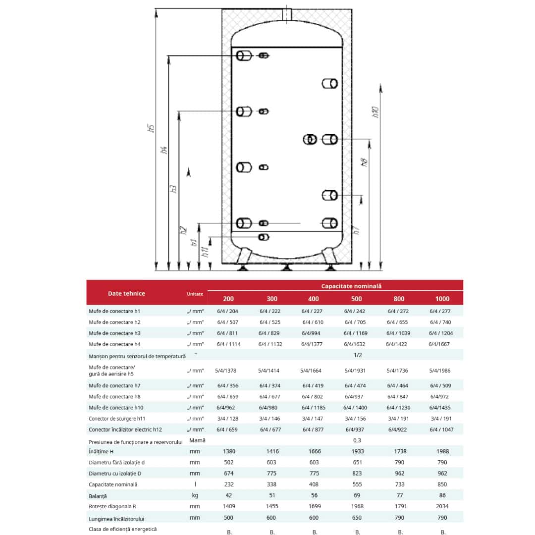 Pufferul 1000L izolat Termo+ este proiectat pentru sisteme de încălzire complexe, oferind o capacitate mare de stocare a agentului termic și o eficiență energetică ridicată. Instalarea trebuie realizată doar de personal autorizat, cu experiență în sisteme termice.